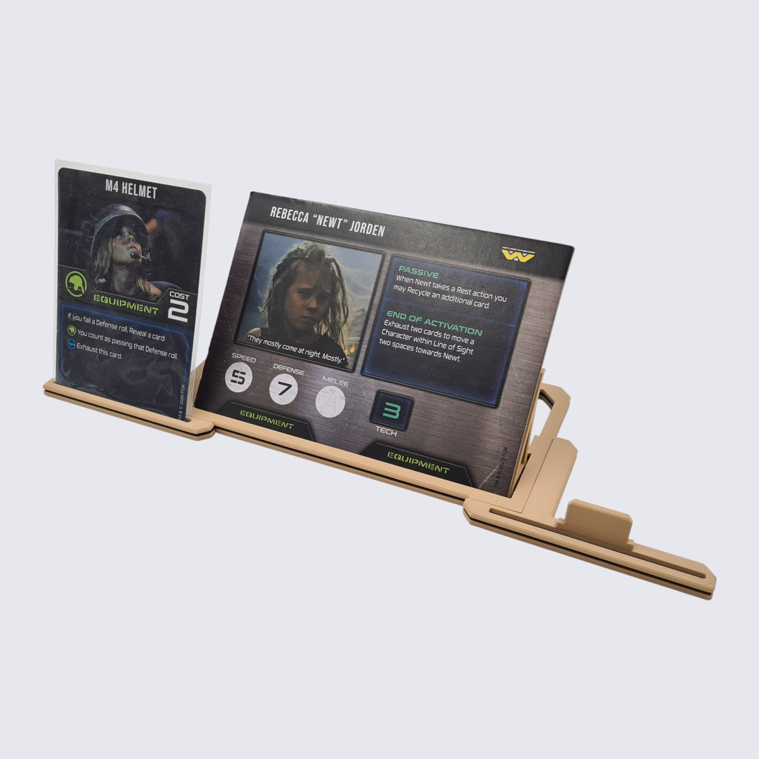 The player card sits in the raised centre of the tray. Slots on either side accommodate up to two weapons and two equipment cards. Slots hold sleeved and non-sleeved cards.