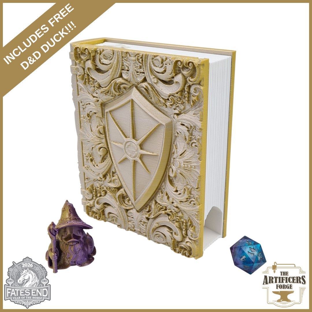 This highly detailed Paladin Tome, inspired by the Paladin D&D Class, is designed by the talented Fates End Studios and brings a striking addition to your gaming table whilst ensuring fair and random dice rolls every time. The clever design allows the inside ‘pages’ to slide out revealing dice trays and storage compartments!