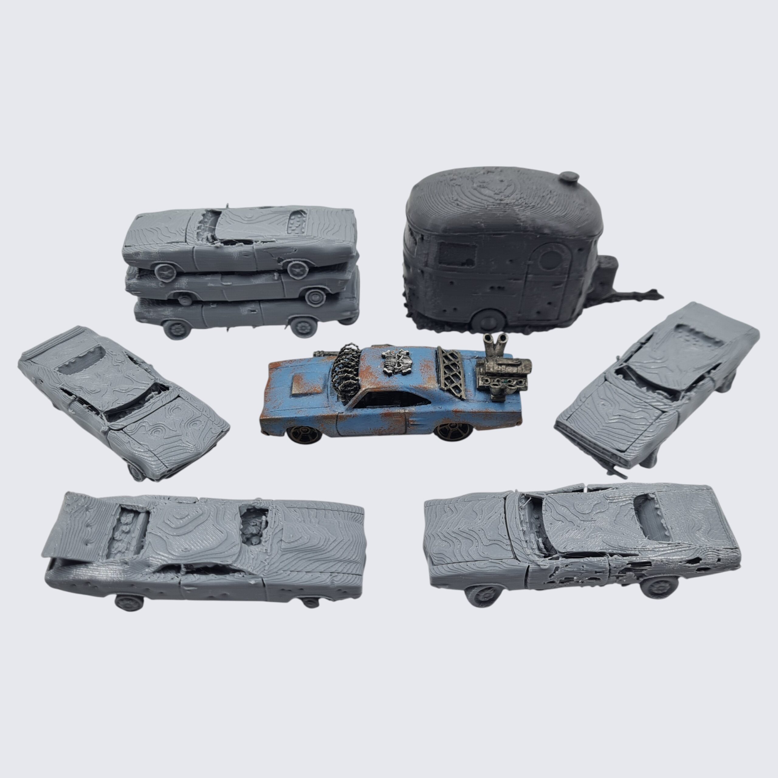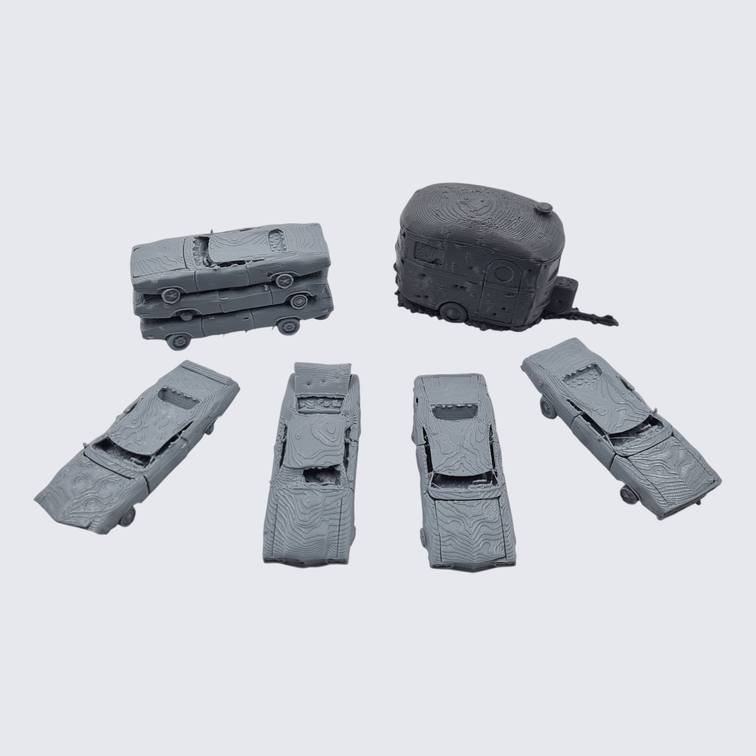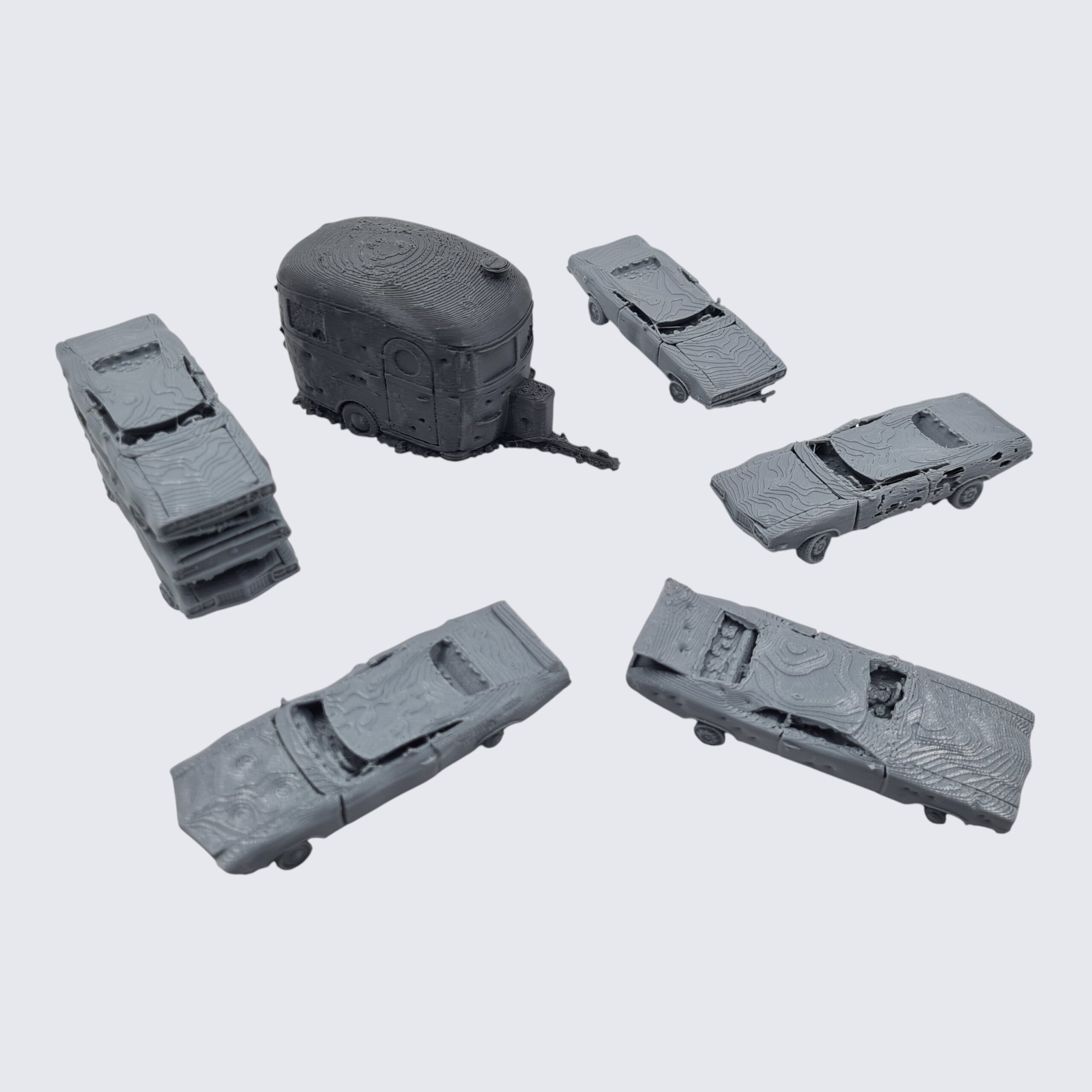 This Sale Product Listing is for 4 individual Wrecked Cars and 1 Wrecked Car Stack printed in 20mm (Gaslands) scale.